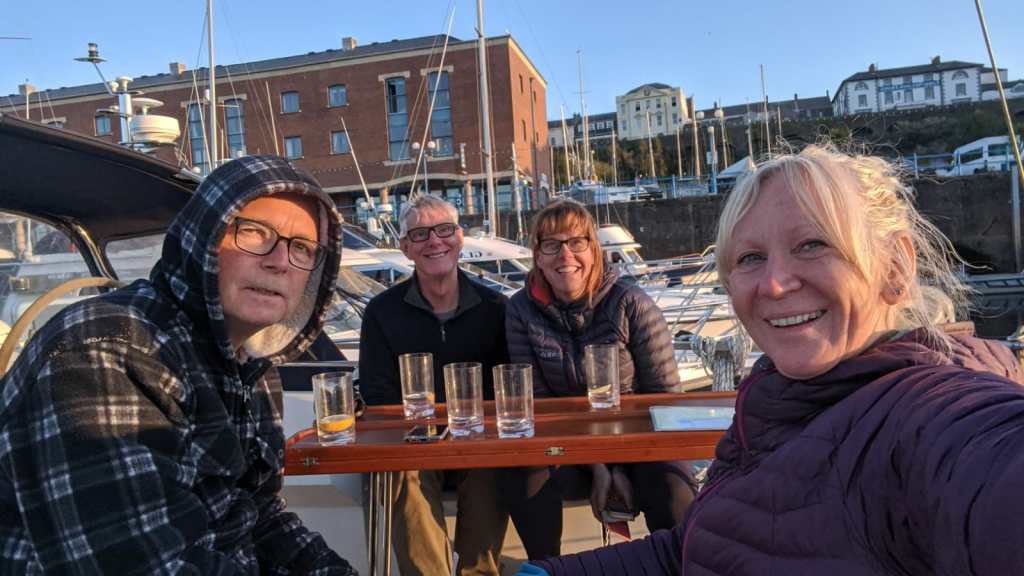 So we arrived in Milford Haven marina all a little exhausted and entered the lock. Dave made some specious remark about the marina that prompted Karen to say “What do you expect, a welcome pack?” Anyway the lock keeper climbed down the ladder to the lock pontoon where we were tied up, to welcoming us to the marina., (They hadn’t had many visitors so he was pleased to see some strangers) and he gives us a welcome pack!!! Ha!! We then pulled into our allotted berth and 2 local chaps from the boat next door were waiting to take our lines. Great marina, great staff and super friendly locals.