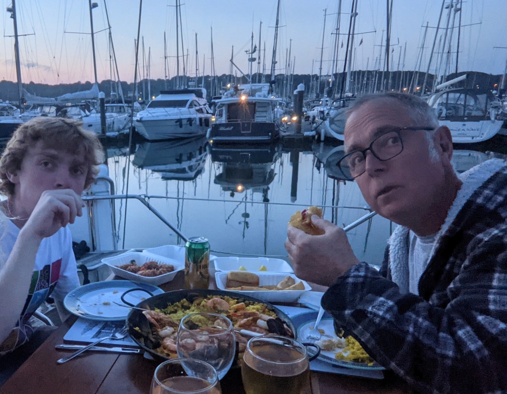 The next day, time to go home. So we head off for an overnighter to Porthdinllaen to take Richie to the Ty Coch pub. We had a lovely overnight sail but when we arrived at Porthdinllaen the pub was closed because some staff caught covid. We stayed the night and the following day had a great sail back to Pwllhelli blasting through Bardsey sound. Got home to Pwllhelli and had a lovely meal from the Spanish takeaway, paella and fish tacos, to finish off a most memorable trip to Scotland and Northern Ireland.