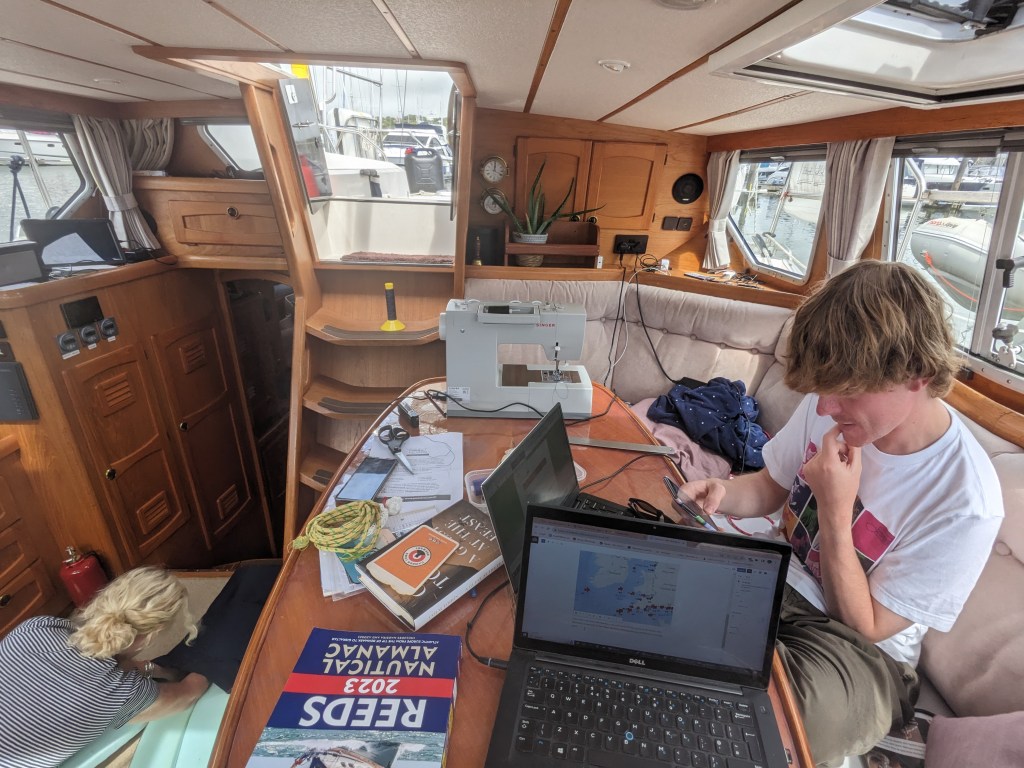 Looks like it all clears this Sunday so we will hopefully get going to the Scillies then. Meanwhile I have jobs in the bilges, Mandy is making cushions and Richie is learning knots.