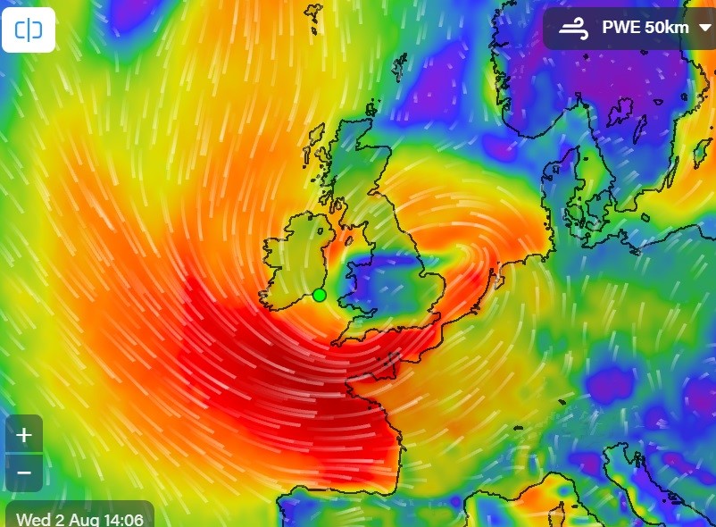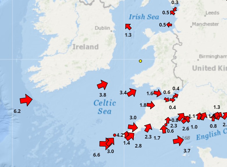 These are the current wave heights in the Irish sea. (Using Cefas – Thanks Russ) Down by the Scillies the wave heights are 6.6 metres, never seen that big before. Unseasonably unsettled weather.